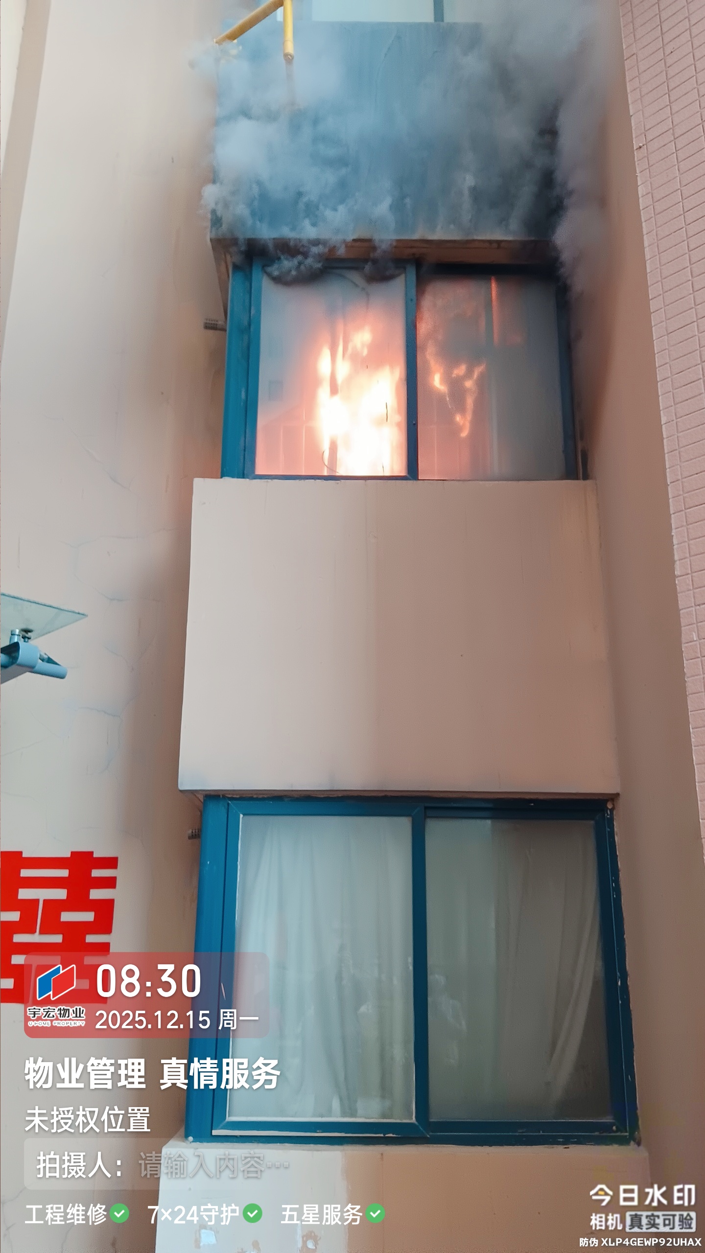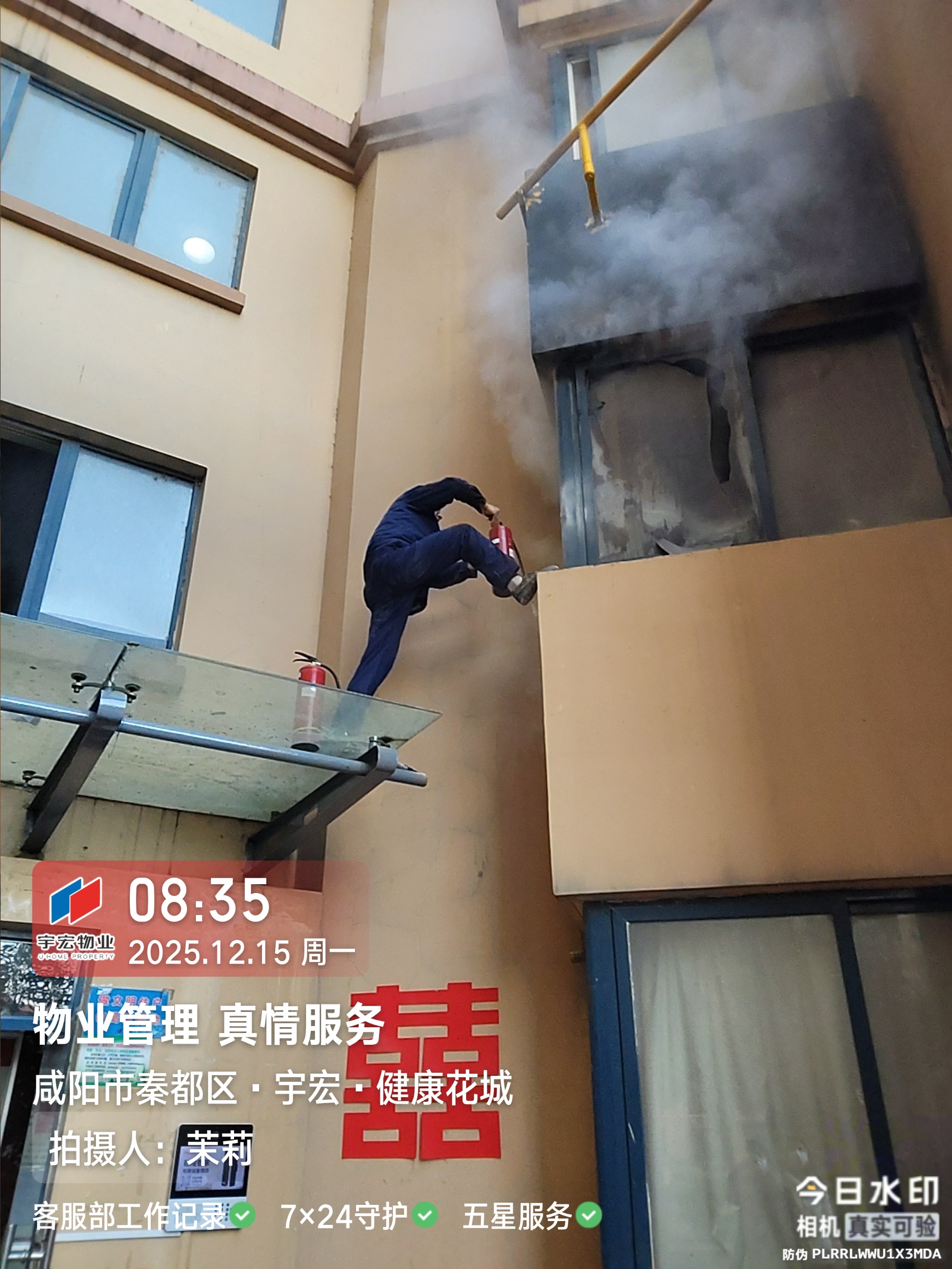 2025年12月15日,宇宏花城小区突发火情,危急时刻,物业人员陈永锋、杜虎、郭胜利挺身而出,物业经理带领团队迅速到场展开救援,成功扑灭火灾,守护了业主的生命与财产安全。